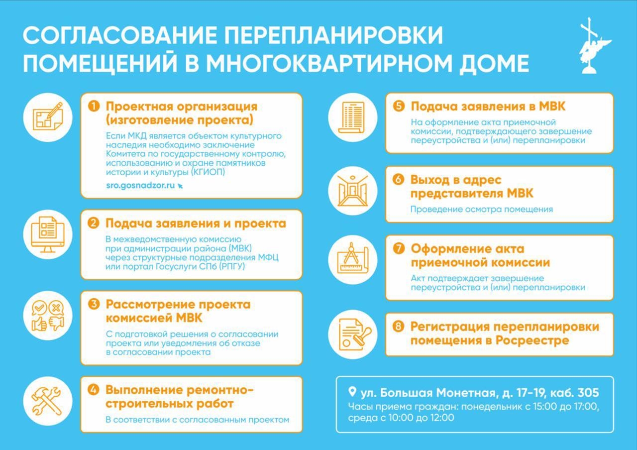 Уважаемые наши жители, администрацией Петроградского района разработан алгоритм действий по проведению и согласованию работ по перепланировке и (или) переустройству помещений в многоквартирном доме.